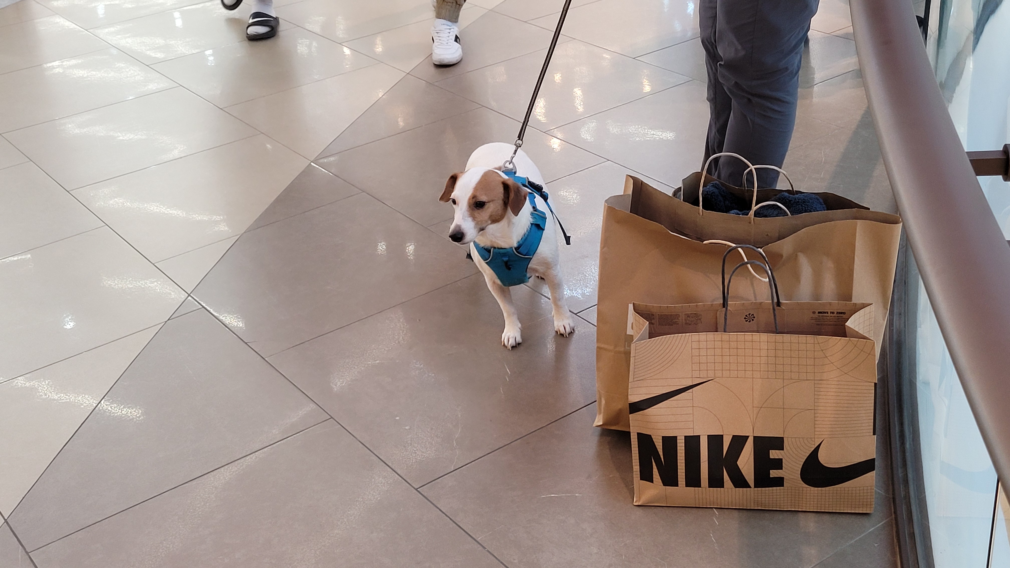 외국인이 반려견과 나이키제품 잔득 사들고 쉬고있다.