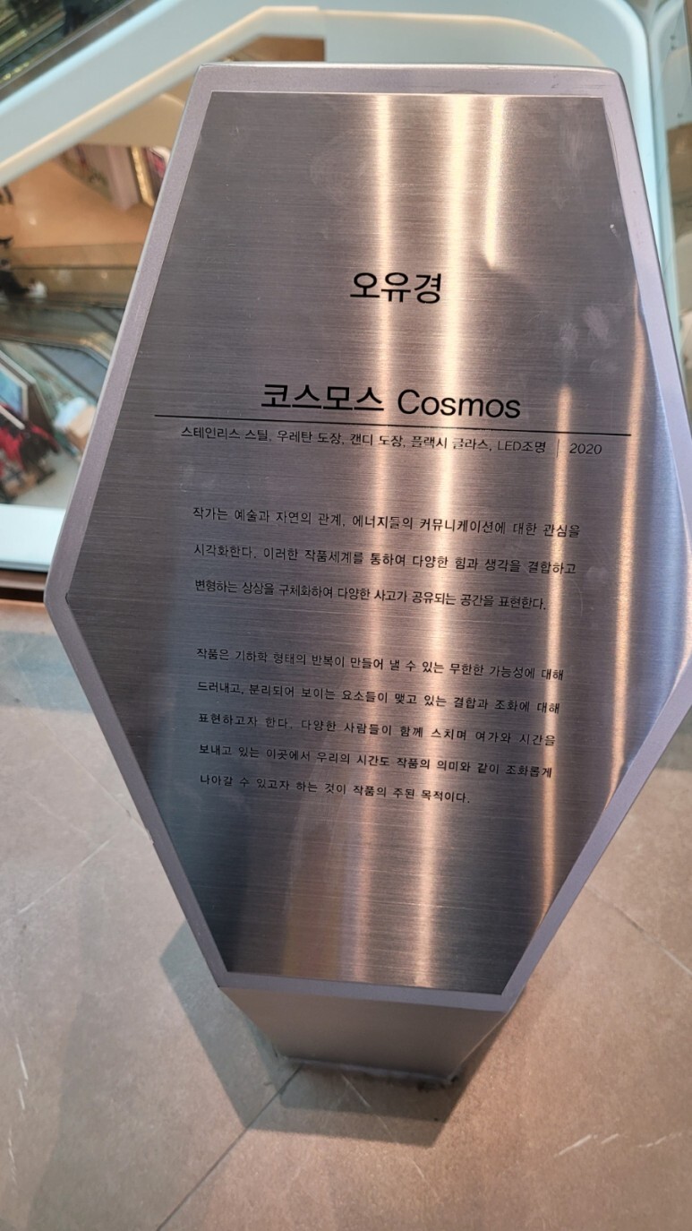 오유경의 코스모스라는 작품이 천장에 매달려 있는 모습이 시선을 잡았다.