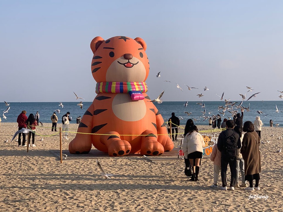2022년을 맞이해서 만들어진 복호랑이 대형 풍선 인형, 훼손하지 못하게 라인이 쳐져 있고, 그 앞에 많은 사람들이 사진을 찍어서 한해의 복이오길 기원하고 있습니다.
