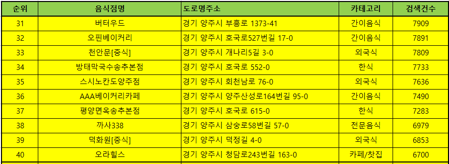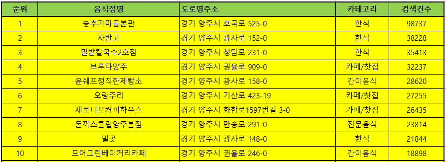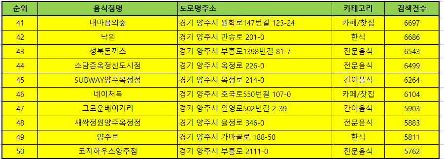 안녕하세요. 전국맛집을 알려드리는 일상탈출입니다. 오늘은 경기도 양주 맛집 추천해 드리겠습니다. 양주 맛집 베스트10은 유명해서 사람들이 많이 방문하는곳 10곳이며, 양주맛집 방문순위 TOP50 알려드립니다. 보시다가 글씨가 작거나 화면이 보이지 않으면 확대해서 보시면 됩니다.