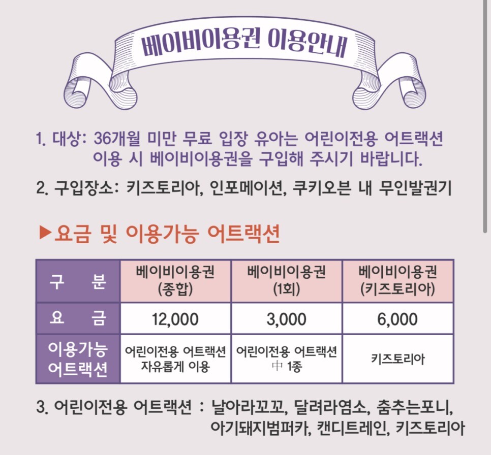 아마도 우리가족은 둘째 무료입장이 가능하지만 베이비이용권을 구입할 것 같다. 키즈토리아는 아래에 더 자세하게 설명하기로 하자.
