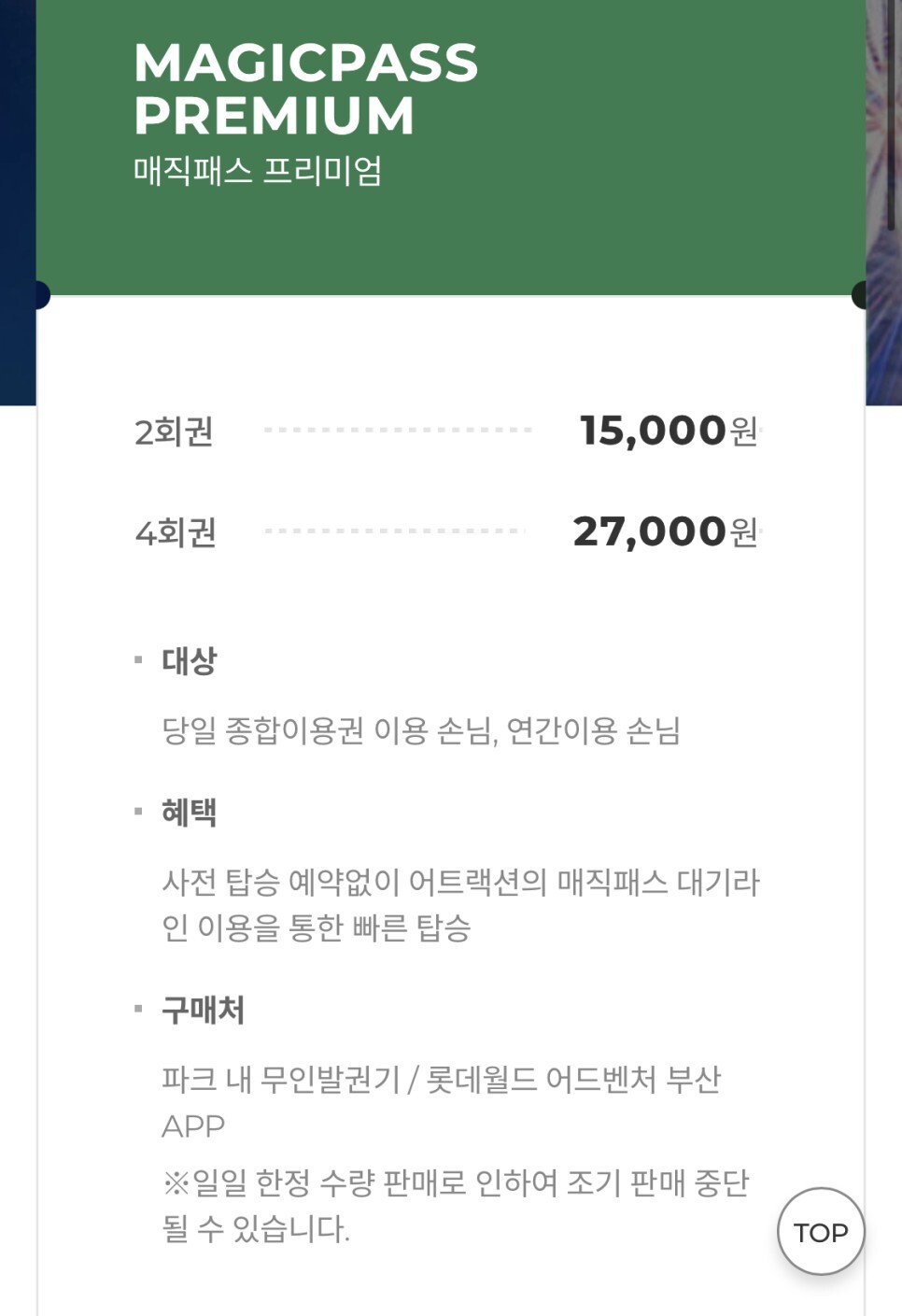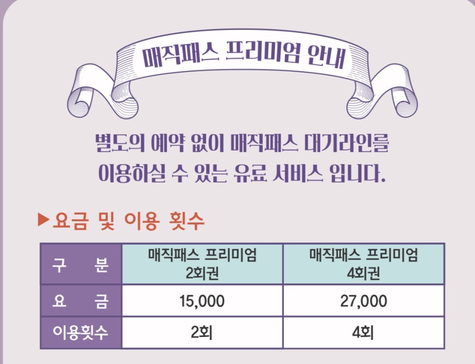 그렇다면 자유이용권을 끊고 무작정 타고 싶은 놀이기구 앞에서 무한정 기다려야 하는 것인가. 그것도 아니다. 난 시간이 금이다! 기다리는게 정말 싫다 하는 분들은 매직패서 프리미엄을 또 추가로 구입하면 된다.