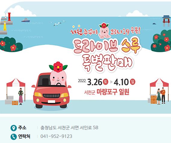 선홍빛 동백꽃과 서해안 앞바다에서 갓 잡아 올린 주꾸미를 맛 볼 수 있는 <서천 동백꽃 주꾸미 축제>가 올해는 비대면 방식의 주꾸미 드라이브 스루 특별판매 행사로 추진된다. 동백꽃 개화시기에 맞춰 추진되는 이번 행사는 서천군 서면 마량포구 일원에서 개최되며 차에서 내리지 않고 원스톱으로 주문부터 구매까지 가능하다. 주꾸미는 1kg단위로 판매되며 서천군의 특산품도 구매 가능하오니 많은 이용 바란다.