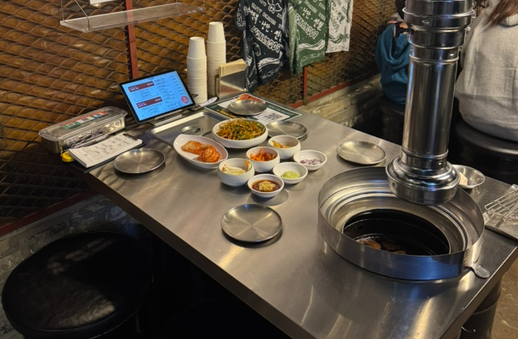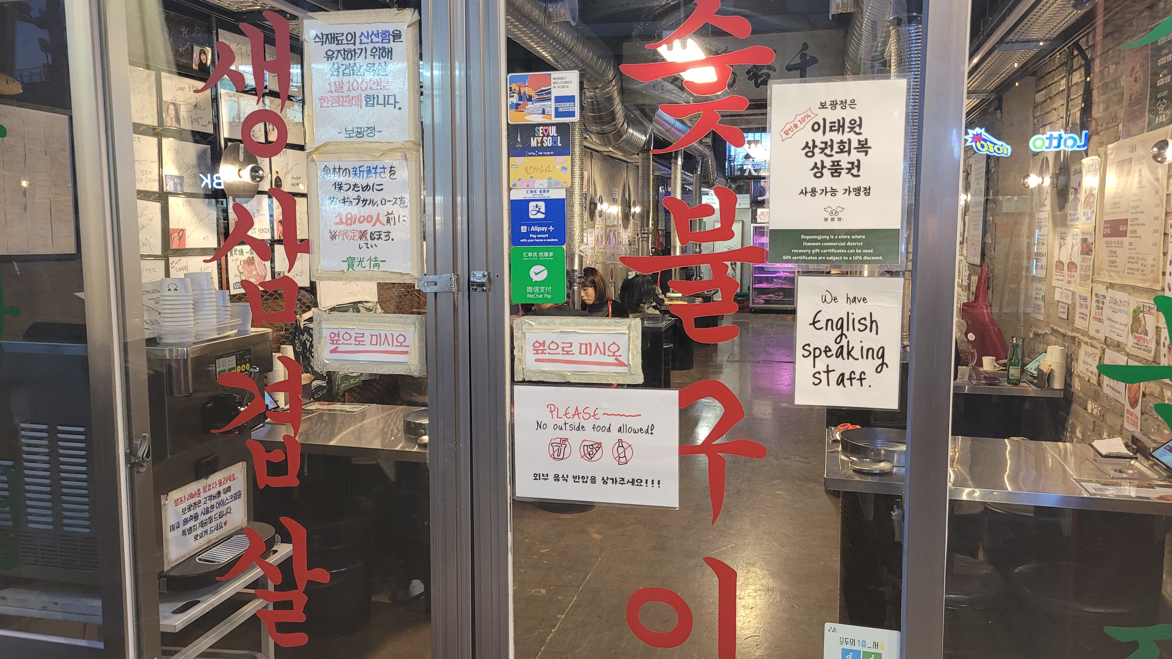 들어가는 입구부터 맛집 분위기가 느껴지시나요. 숯불구이 생삼겹살이 전문점 답게 출입문에 붙여 났어요. 그리고 외국인들도 많이 찾는 곳이라 한글과 함께 영어도 같이 안내 하고 있습니다.