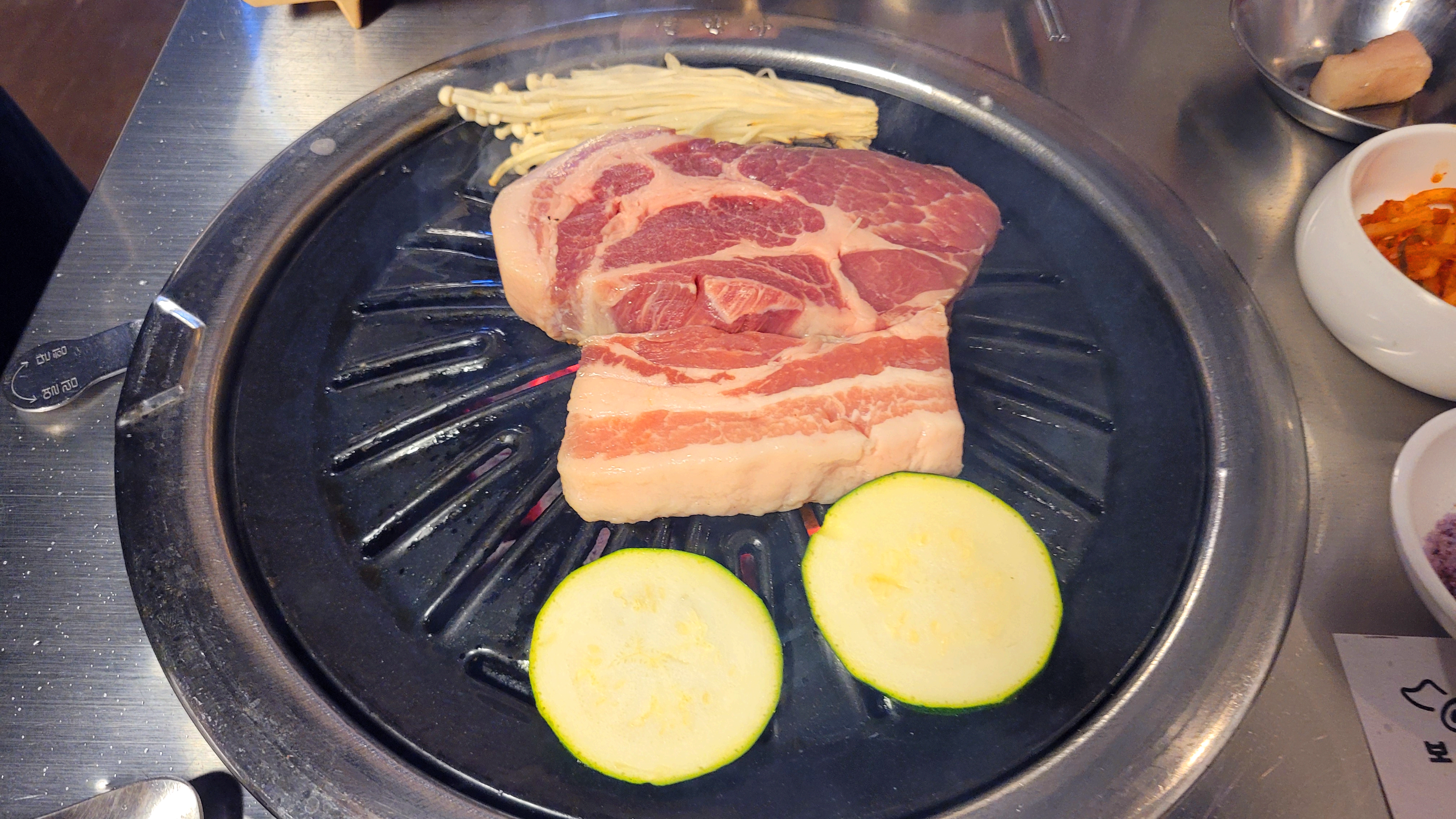 가위로 작게 잘라서 한입에 쌈싸 먹기에 적당한 크기로 나오고, 호박과, 팽이버섯도 잘 구워져 나옵니다. 아참 직원이 직원 구워서 접시에 담아 주기에 너무 편리하게 먹을수 있답니다.