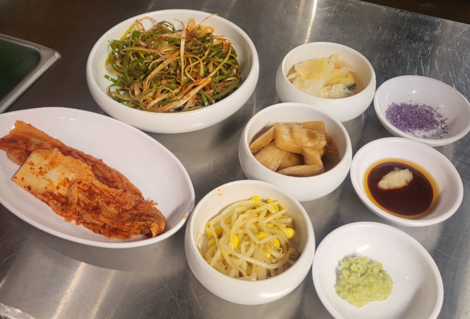 반찬은 국내산 김치와 파채, 콩나물, 백김치, 양파 그리고 소스로는 겨자소스, 양늘간장, 소금이 나옵니다.