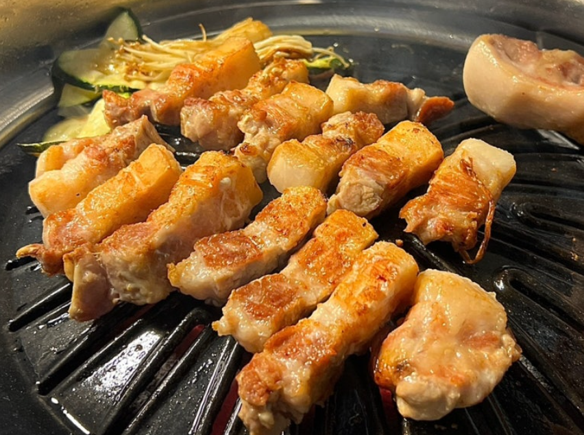 노릇노릇하게 익어가는 삽겹살 먹음직스럽게 익어가고 있습니다. 여기고기는 1cm 이상의 두께로 썰어져 나옵니다.