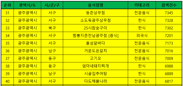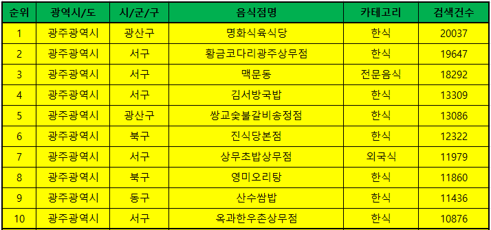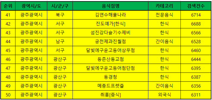 안녕하세요. 전국맛집을 알려드리는 일상탈출입니다. 오늘은 광주광역시 맛집 추천해 드리겠습니다. 지난번에 광주 맛집 베스트10 (1탄) 후 2년만에 광주 맛집 베스트10(2탄) 소개 시켜 드리겠습니다. 글 아래 쪽에 보시면 최근 1년 동안 네비게이션 검색 광주 맛집 방문 순위 TOP50 리스트도 있으니 참고하세요.