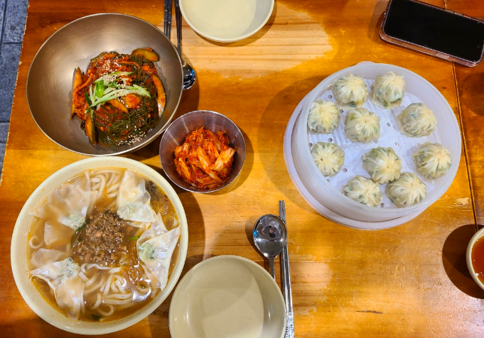 1966년 창업이후 명동에서 본점과 분점, 이태원에 직영점을 운영하고 있는 칼국수 전문 음식점입니다. 찐한 육수가 맛있는 명동교자 이태원점. 오늘은 크로렐라면과 비법양념장이 감칠맛 폭발하는 비빔국수,마늘향이 가득한 겉절이 김치까지 모든 음식이 맛있어서 이태원나오면 꼭 들러줘야할 맛집입니다. 쌀쌀한 날씨에 제격인 구수한 육수에 부드러운 면발과 피만두가 목넘김이 좋다. 면발을 다 먹고 국물에 공기밥을 말아먹는 것은 국룰이다. 밥알 국물에 고깃가루와 양파건더기가 더해져 임팩트 있는 맛이 된다. 비빔국수는 시원한 면발에 고소한 감칠맛이 일품이다.