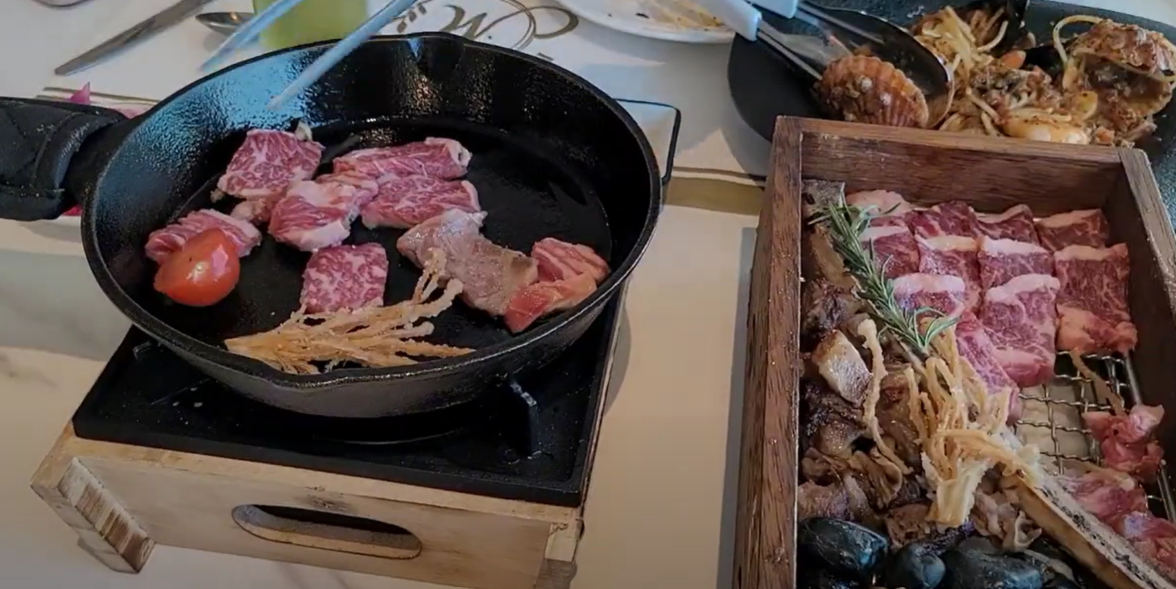 첫 번째로 눈으로 맛보고 두 번째는 소리로 맛보고 세 번째는 혀끝으로 맛볼 수 있는 오감만족의 스테이크 요리입니다. 촉촉한 육즙이 흘러나와서 담백하고 우대갈비살은 부드럽기도 하고 쫄깃하기도 해서 다양한 맛을 느낄 수 있습니다