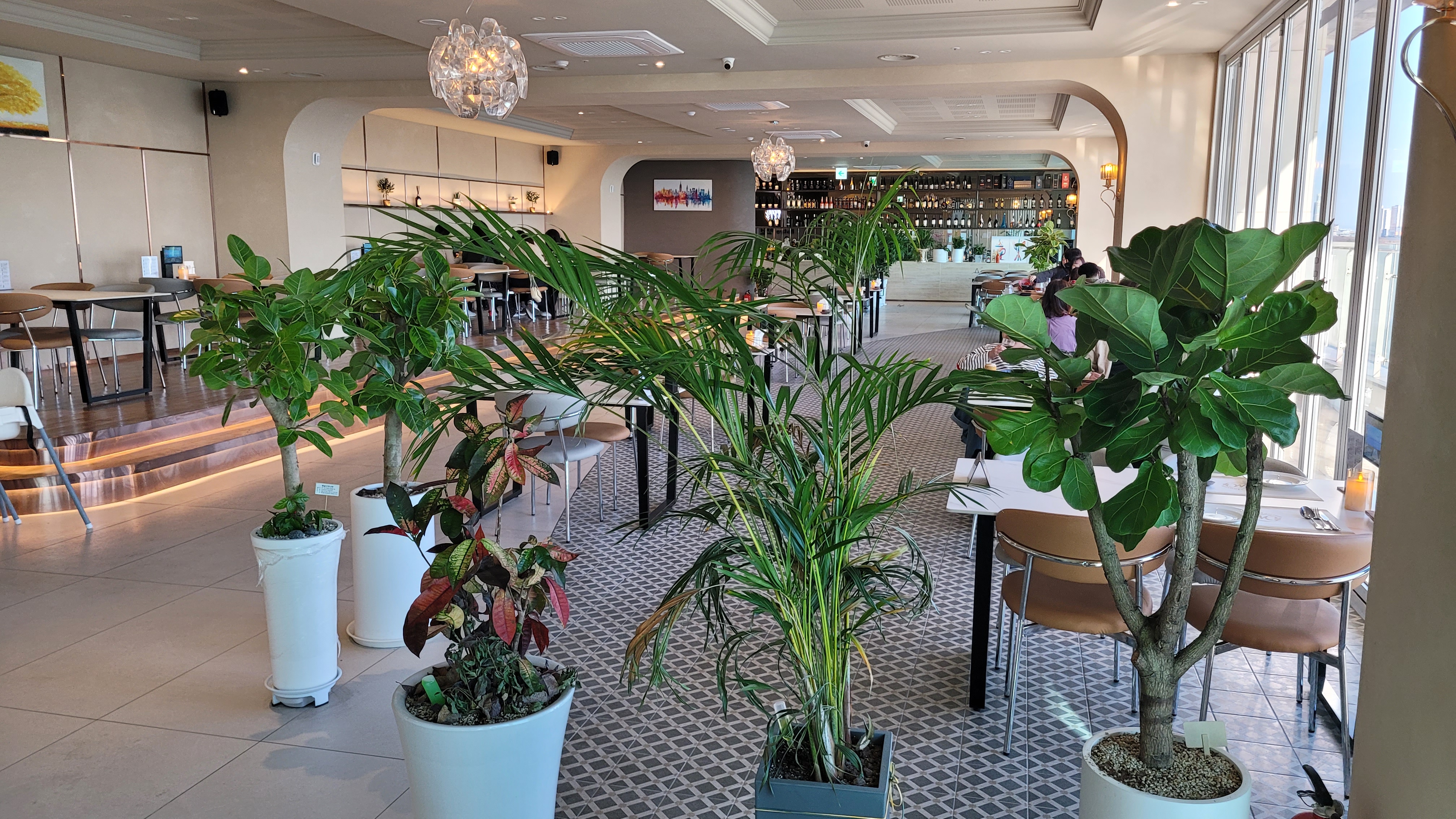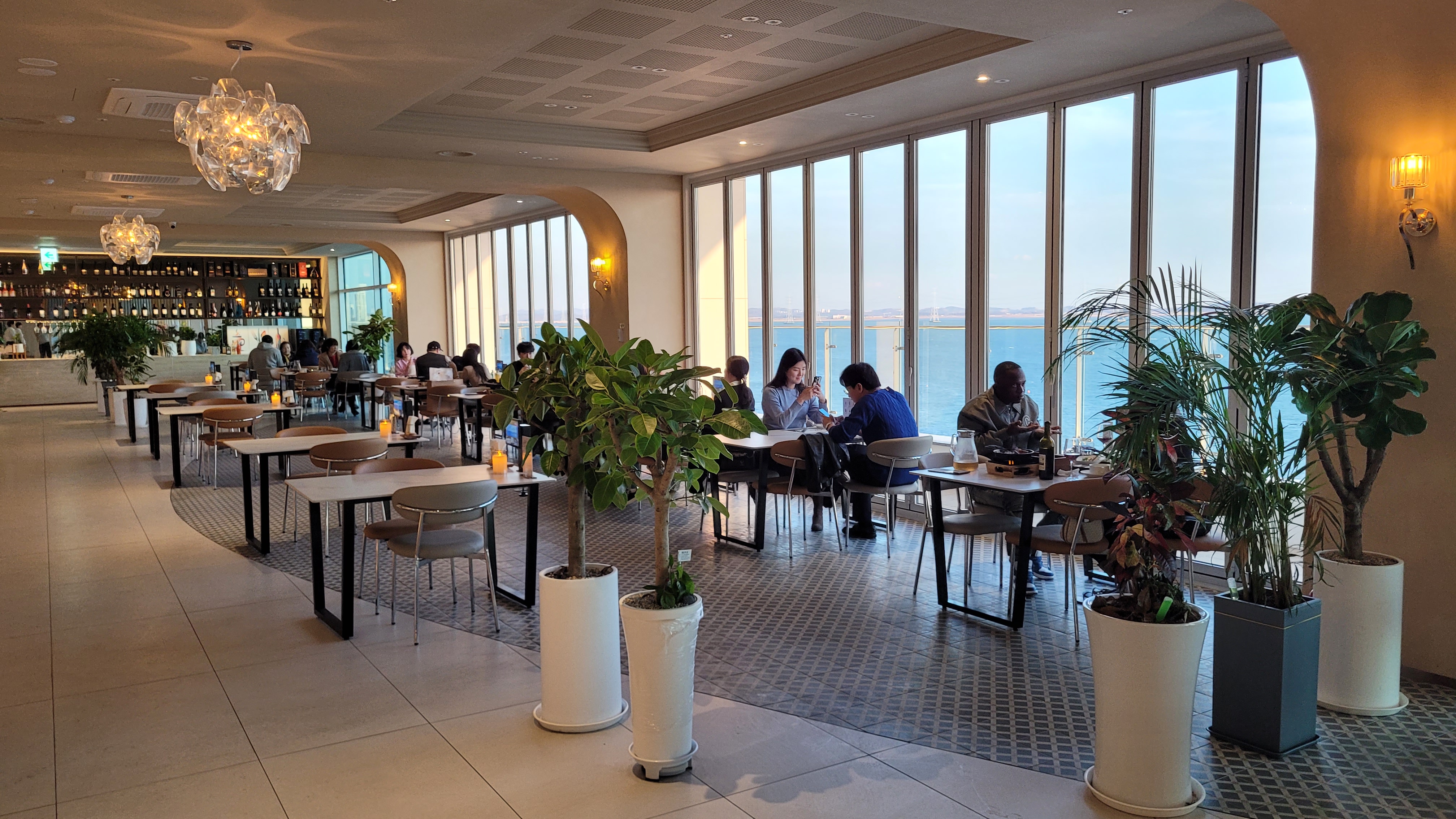 넓은 창을 통해 시원한 바다를 감상하며 식사를 즐길 수 있습니다. 특히 저녁에는 아름다운 노을을 감상할 수 있는 로맨틱한 분위기를 자랑합니다. 넓고 쾌적한 공간: 테이블 간 간격이 넓어 편안하게 식사할 수 있으며, 전체적으로 깔끔하고 세련된 인테리어를 갖추고 있습니다.