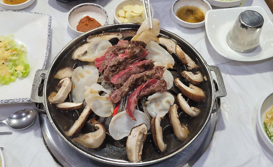 가격대가 좀 있지만 고기질이 좋아요. 부드럽고 돼지갈비도 맛있어요. 돌판비빔밥은 맛있었는데 돌판이 좀더 달궈졌으면 히는 아쉬움이 있었어요. 유명인들이 많이 왔다 갔더라구요. 날이 날인만큼 연휴도 길고 가정의달 이다보니 손님이 많아 좀 정신이 없었지만 직원준들이 착오없이 잘 하시고 친절하세요. 이런 삼합은 처음 봤어요. 육수에 관장와 버섯을 넣고 익히고 고기는 구운 뒤 육수이 담가서 먹는 방식이에요. 재료 3가지를 구워서 먹었던 삼합과 다른 맛이에요. 육수가 되게 한 몫하는거 같아요. 바 찢어지게 먹었어오.기본 반찬도 잘 나오고요. 고기와 관자버섯은 입구에서 직접 골라서 가지고 들어오는 방식이에요. 색다른 방식에 아주 맛도리에요.