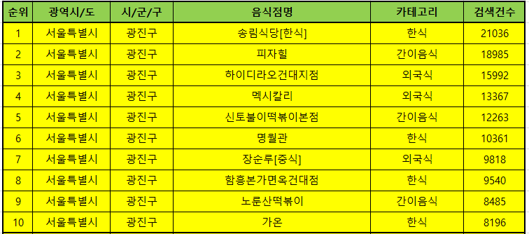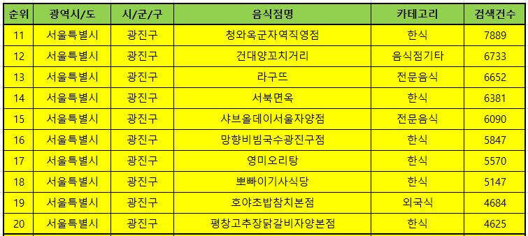 서울 광진구의 주요 맛집 10곳과 광진구 음식점 방문순위 TOP30에 대한 정보를 일목요연하게 정리하여 드립니다..