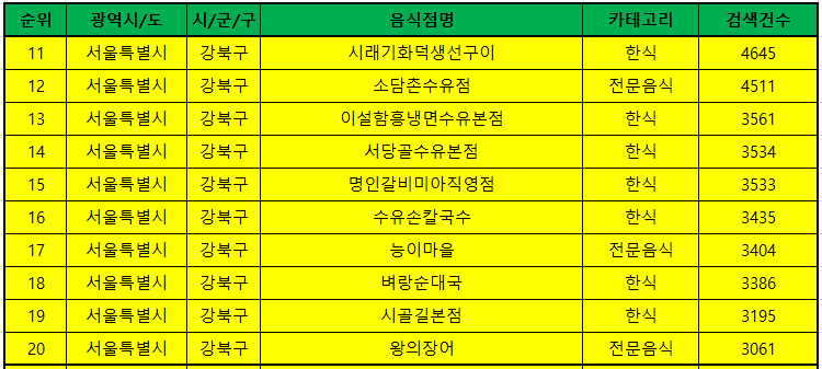 서울 동대문구 맛집 베스트10 빅데이터 방문순위 TOP50 총정리