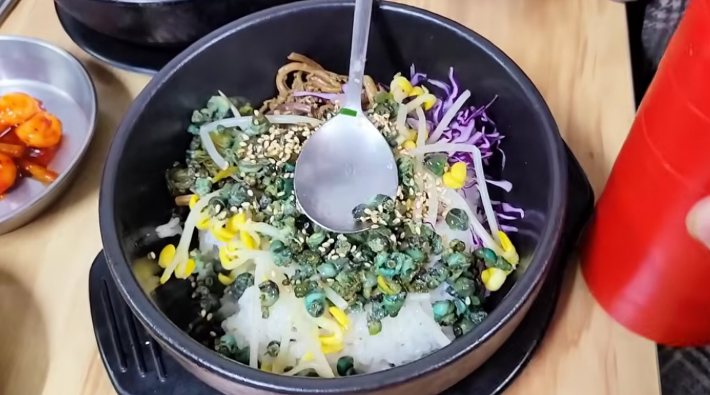 해장국이 '깊은 맛'이라면 비빔밥은 '화려한 맛' 그 자체예요. 커다란 대접에 신선한 상추, 콩나물, 무생채, 김가루가 정갈하게 담겨 나오고 그 위에 다슬기가 산처럼 쌓여 나옵니다.