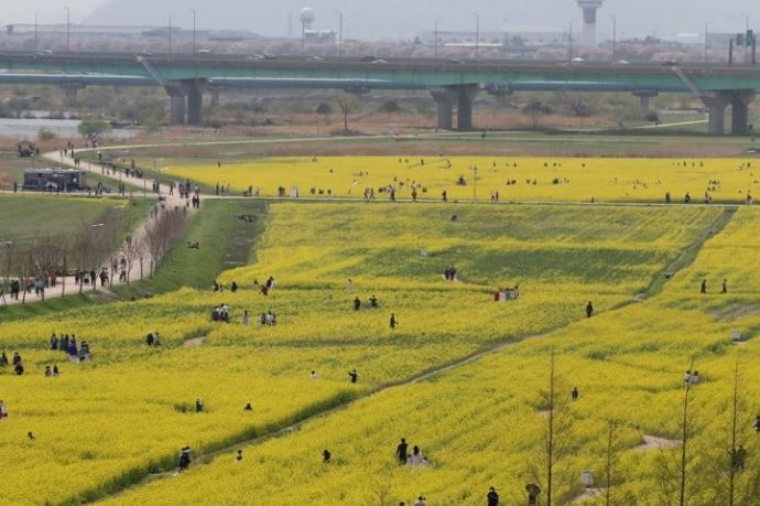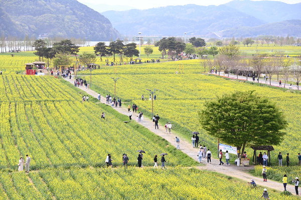 강변을 따라 끝없이 펼쳐진 유채밭은 통일 염원을 담아 한반도 지도 모양으로 조성했다고 하는데 워낙 넓어 모양이 한눈에 들어오지 않는다.